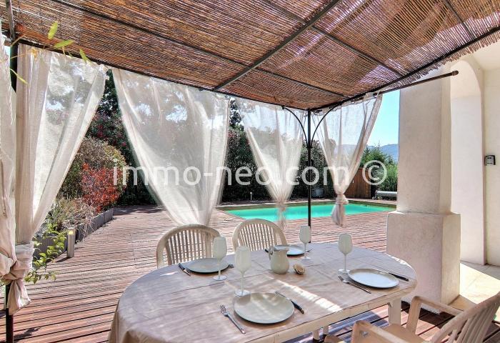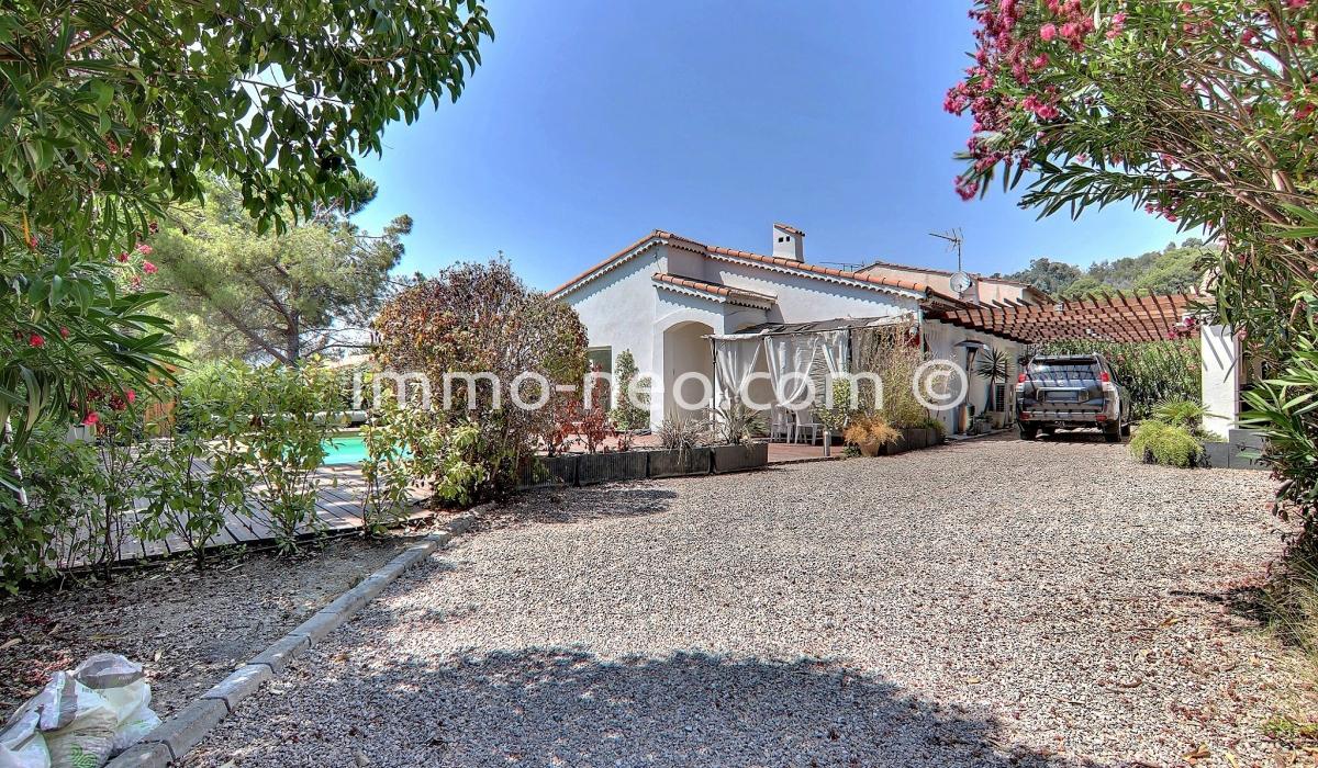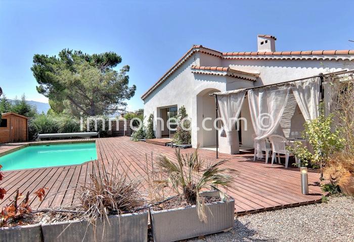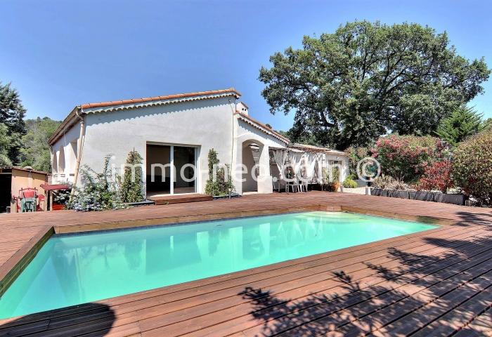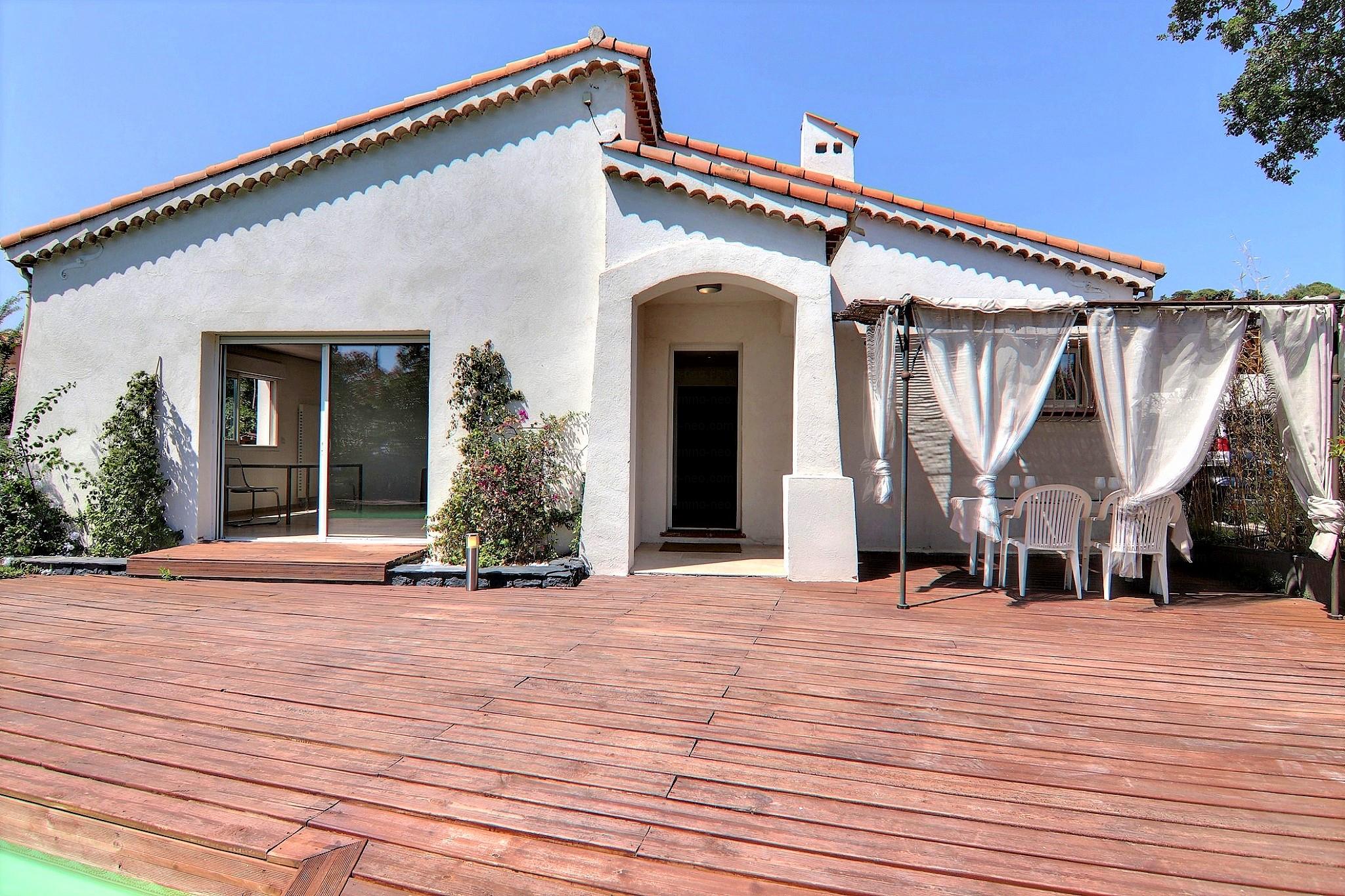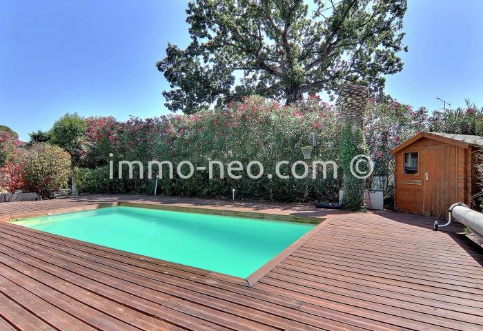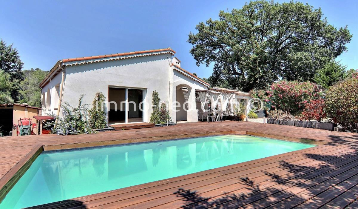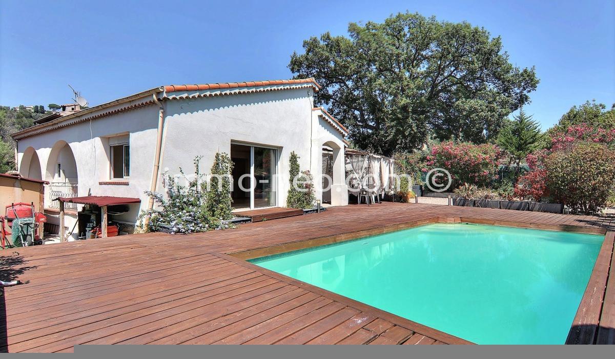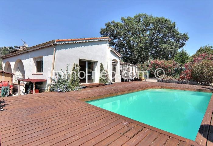 Particulier vend belle villa de plain-pied 5 pièces de 106 m², plus studio indépendant. Construite sur un terrain plat de 667 m² avec une belle piscine, entourée d'une terrasse en pin qui offre une vue sur le Tanneron. Abri voitures, parking et cabanon. Adresse du bien